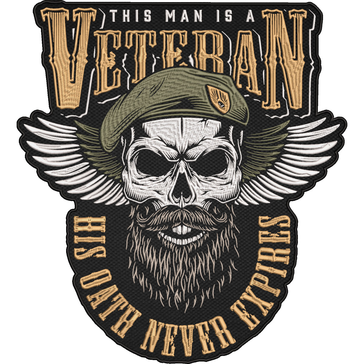 This powerful embroidered patch features a detailed skull with beard and military beret, framed by wings and bold statement lettering:
